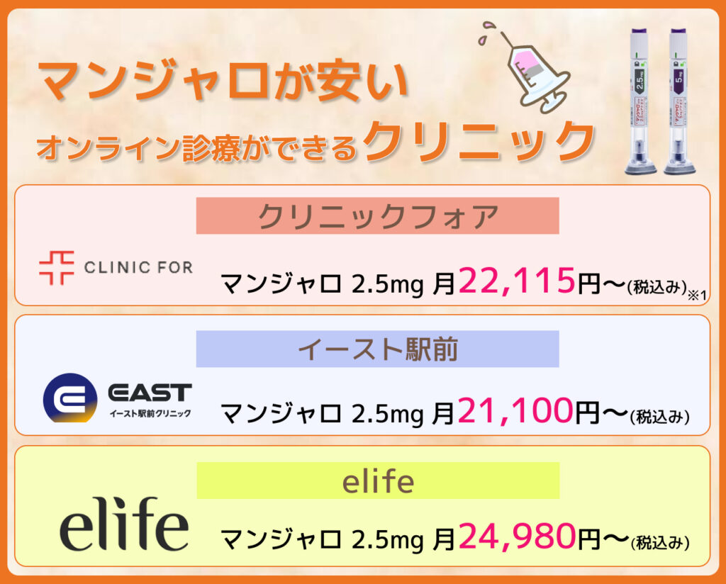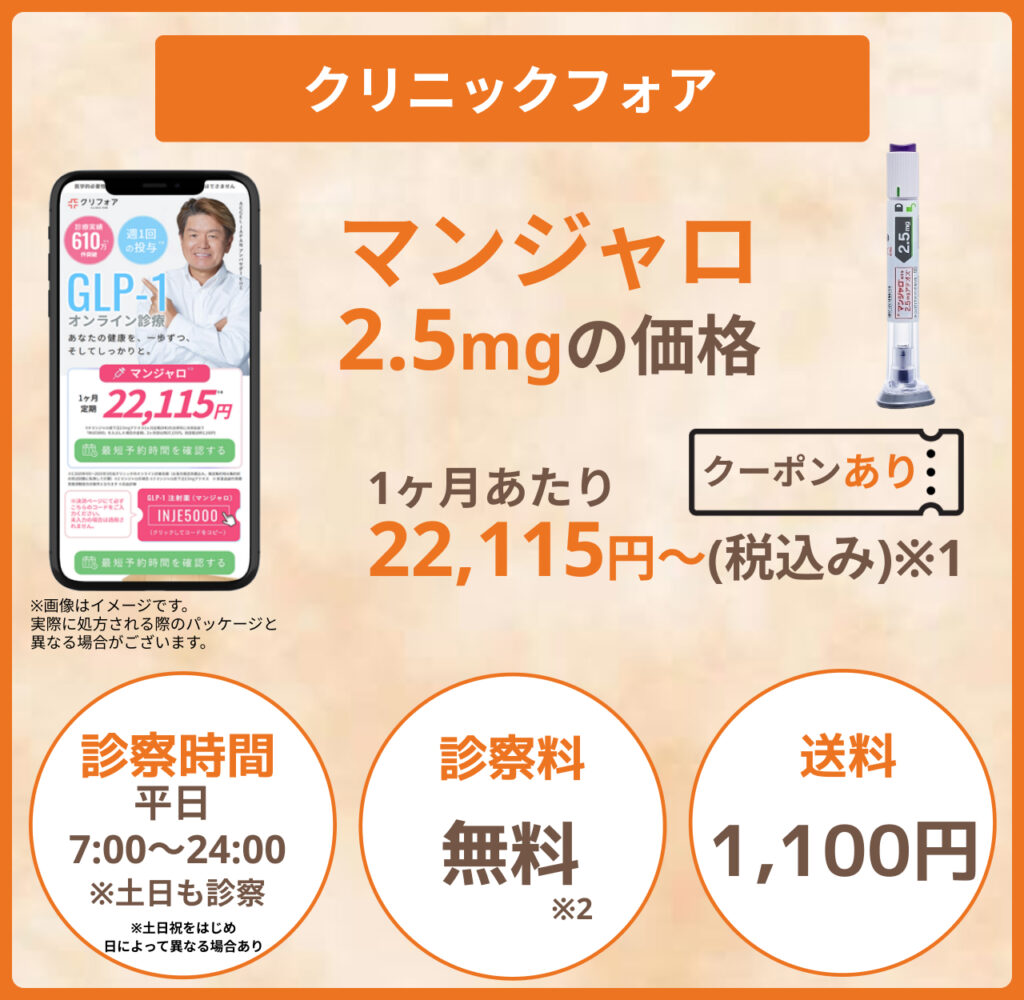クリニックフォアは、クーポン利用で2.5mgの初回定期価格が22,115円(税込み)※1になり、安くマンジャロを入手できます。