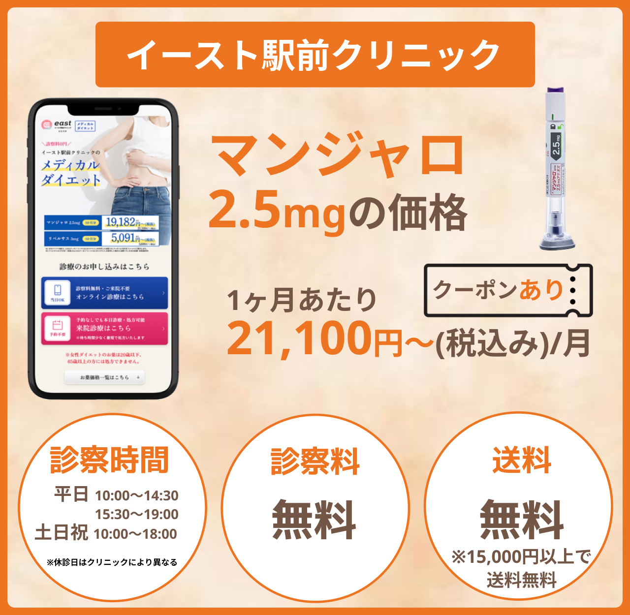 イースト駅前クリニックでは、LINEクーポンを利用すると、2.5mgのマンジャロが初回限定で1ヶ月分21,100円(税込み)で購入できます。
